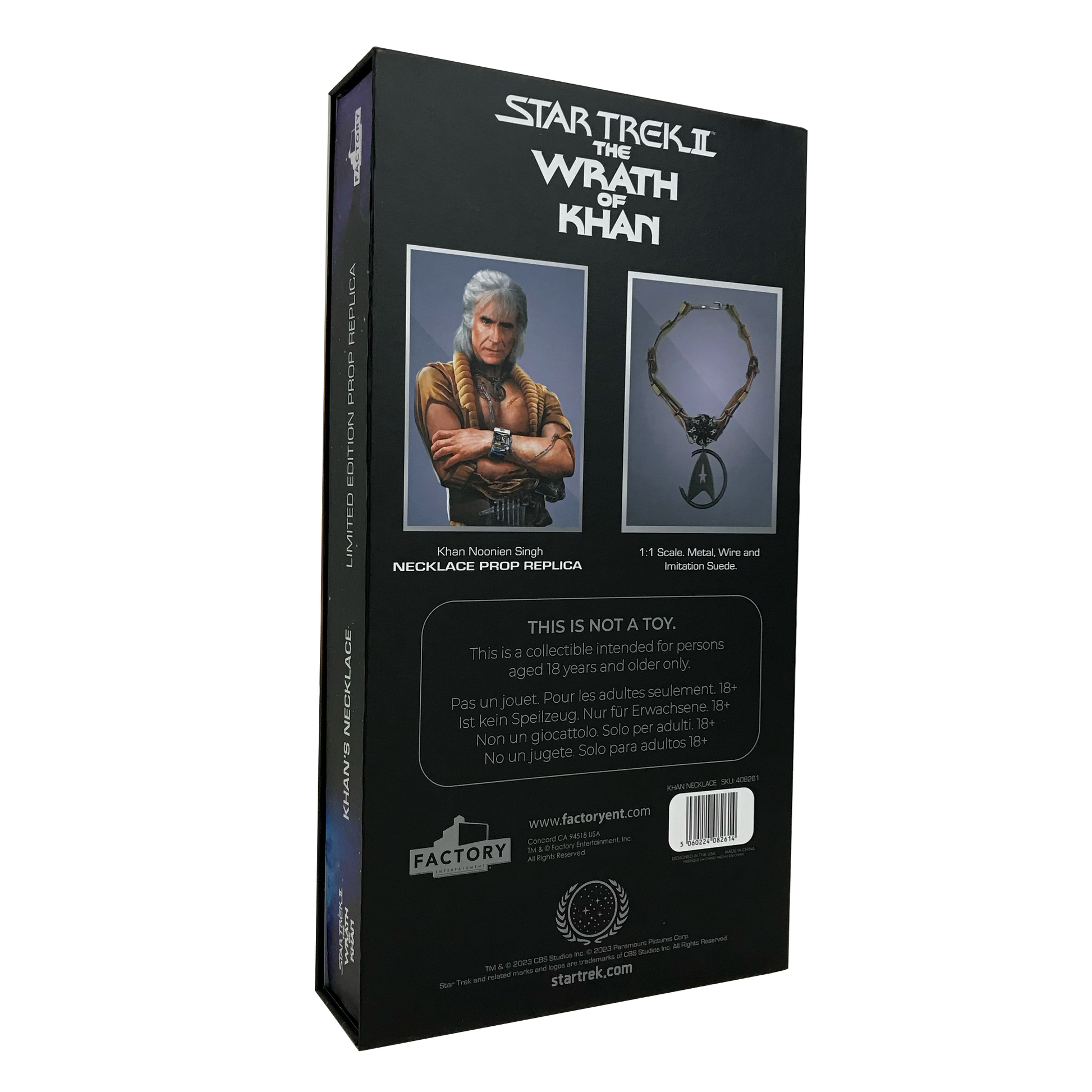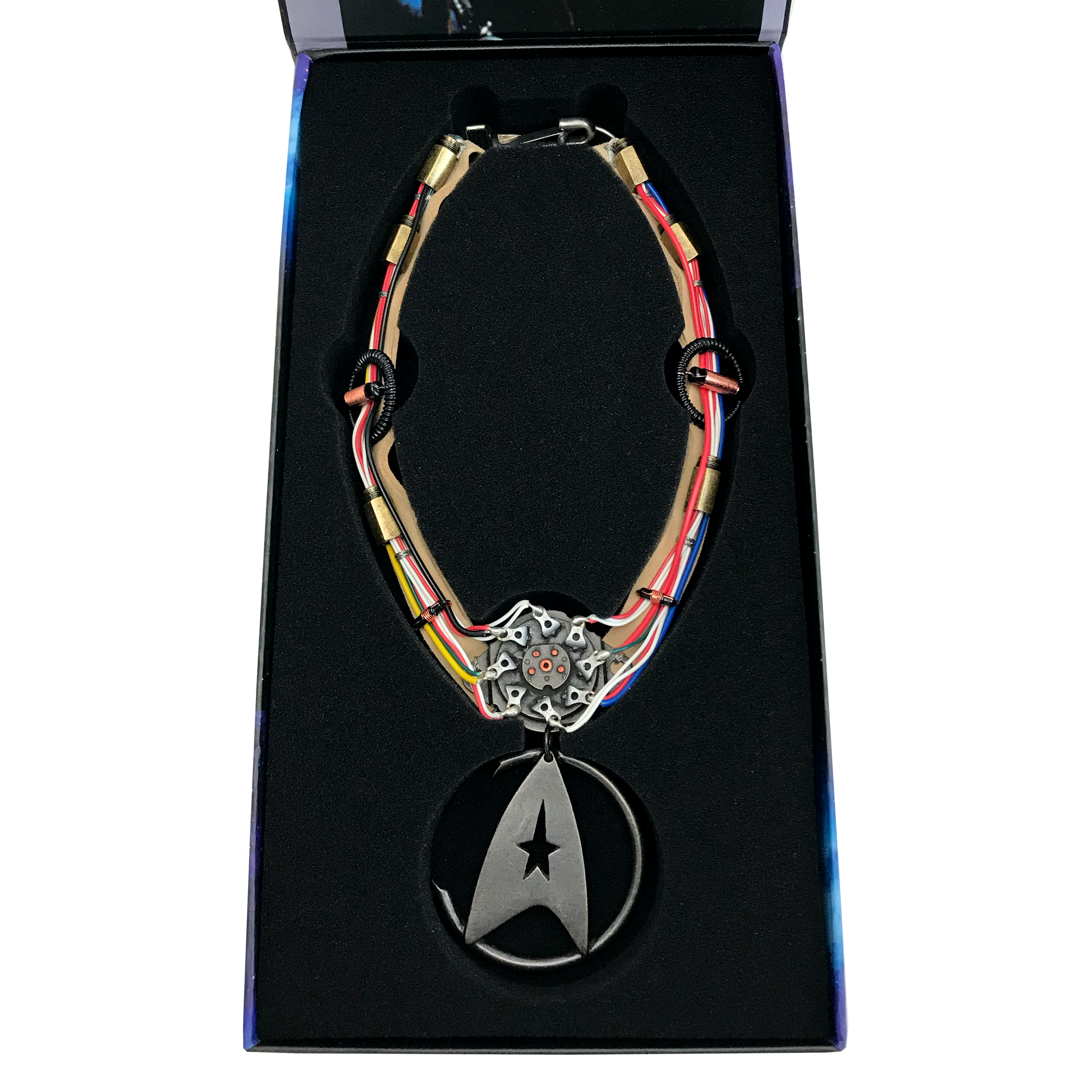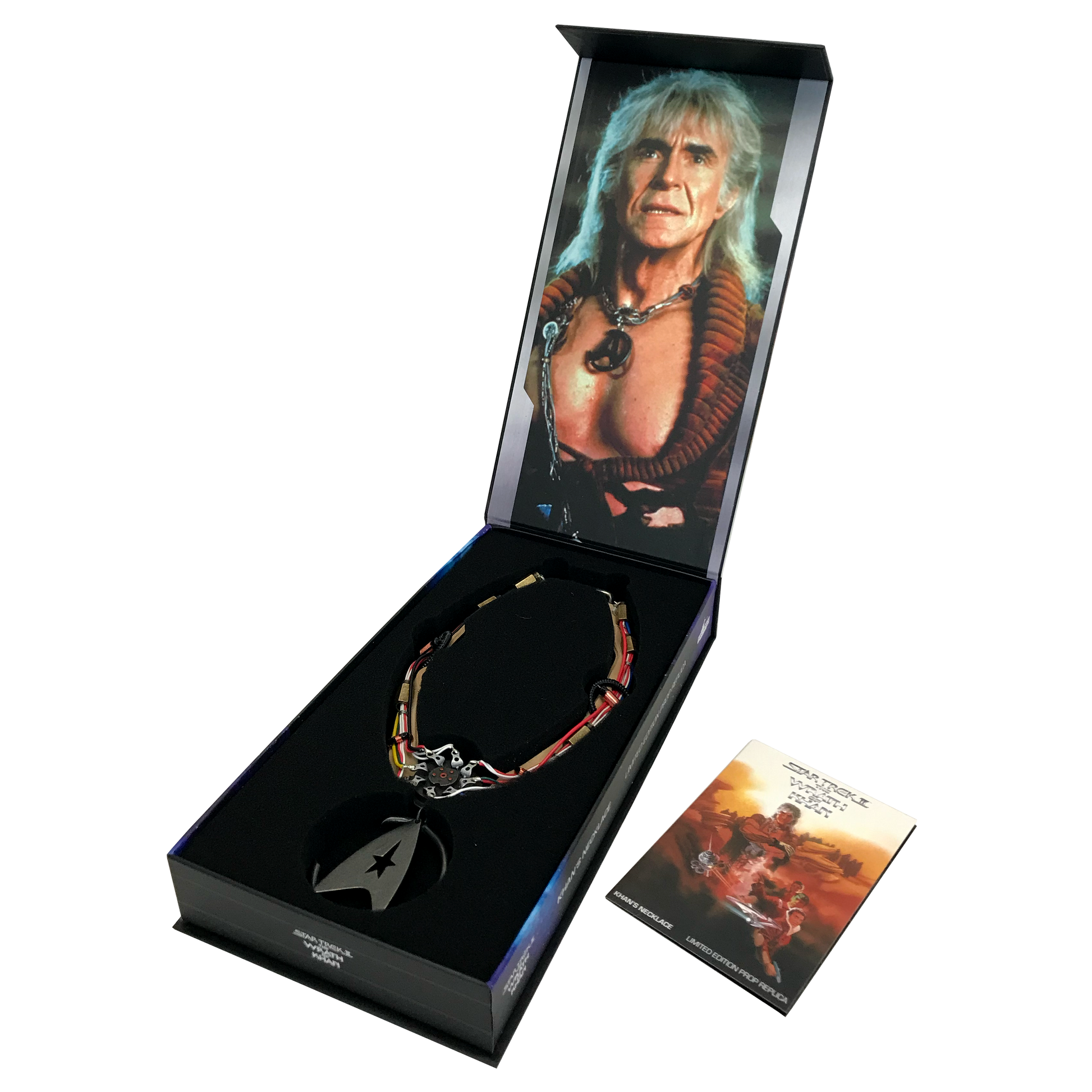 The replica of Khan's notable necklace, featured in Star Trek II: The Wrath Of Khan, is the latest collectible in our line of premium products inspired by Star Trek. During filming, multiple variations of the necklace were used, each featuring unique elements and incorporating real-world components. Our expert team carefully studied the remaining original props and referenced materials from the Paramount Pictures archives to accurately recreate each component. To ensure the highest quality, we meticulously replicated even the most delicate and rare vintage electrical parts in solid metal. From the correct gauged and colored electrical wire to the imitation-suede band that mirrors the original, every detail was thoughtfully hand-crafted. The limited edition replica captures the undamaged necklace as seen throughout the film, before the significant battle damage it sustained in the Mutara Nebula. Packaged in a magnetic flap gift box and accompanied by a COA booklet with a unique number, this replica pays tribute to the iconic U.S.S. Reliant with a limited edition of only