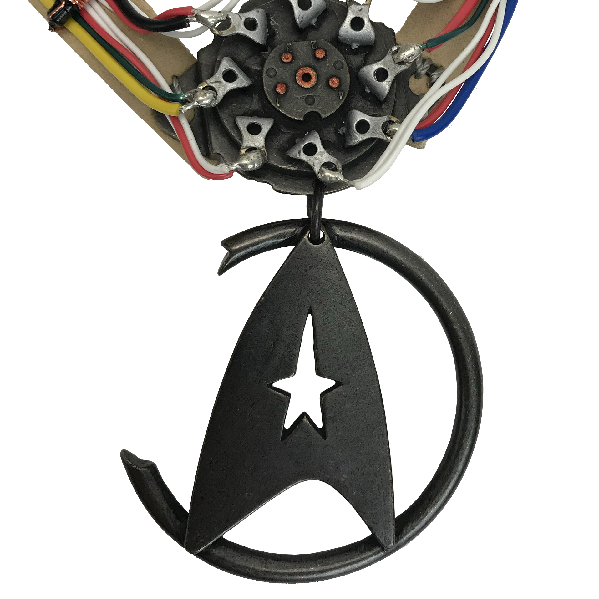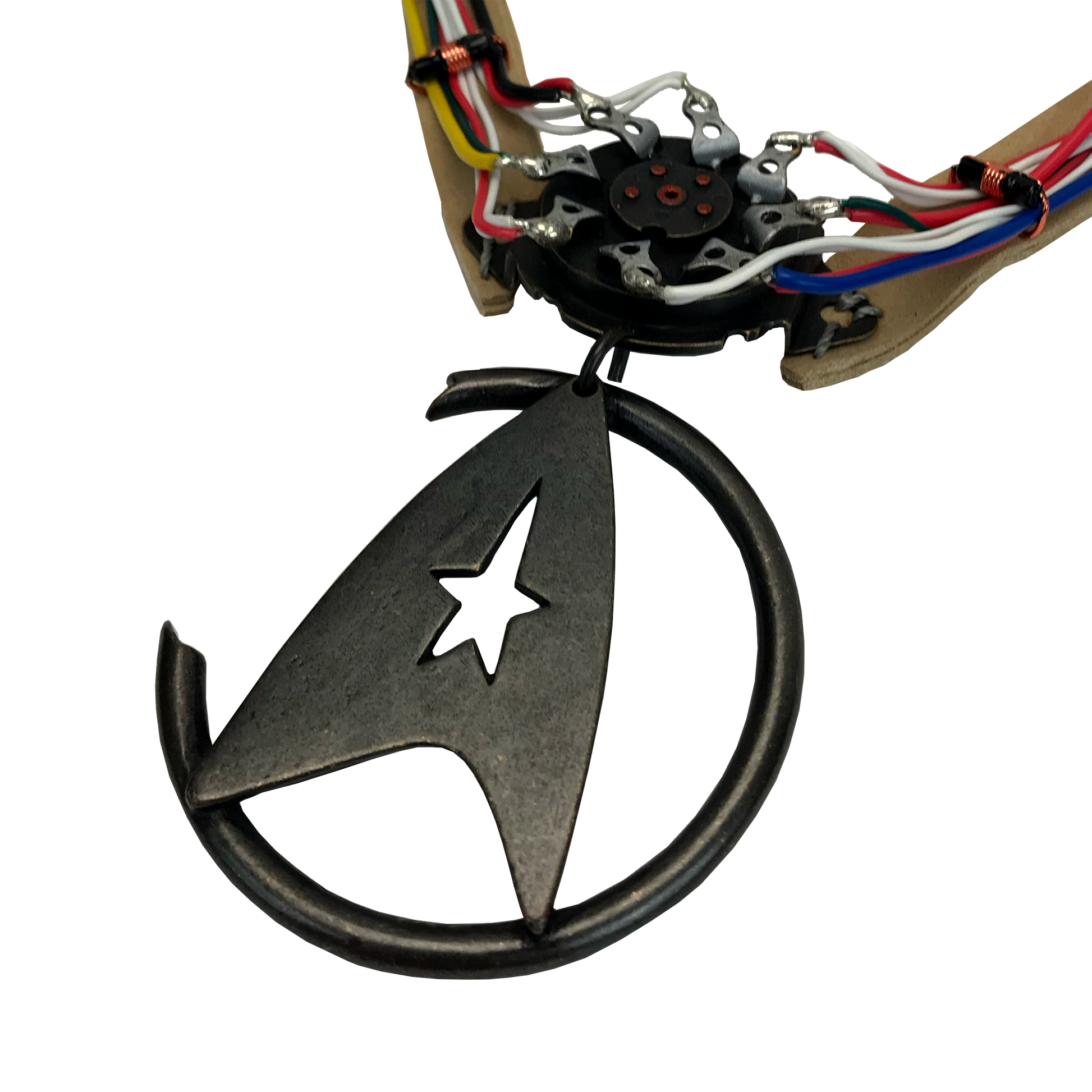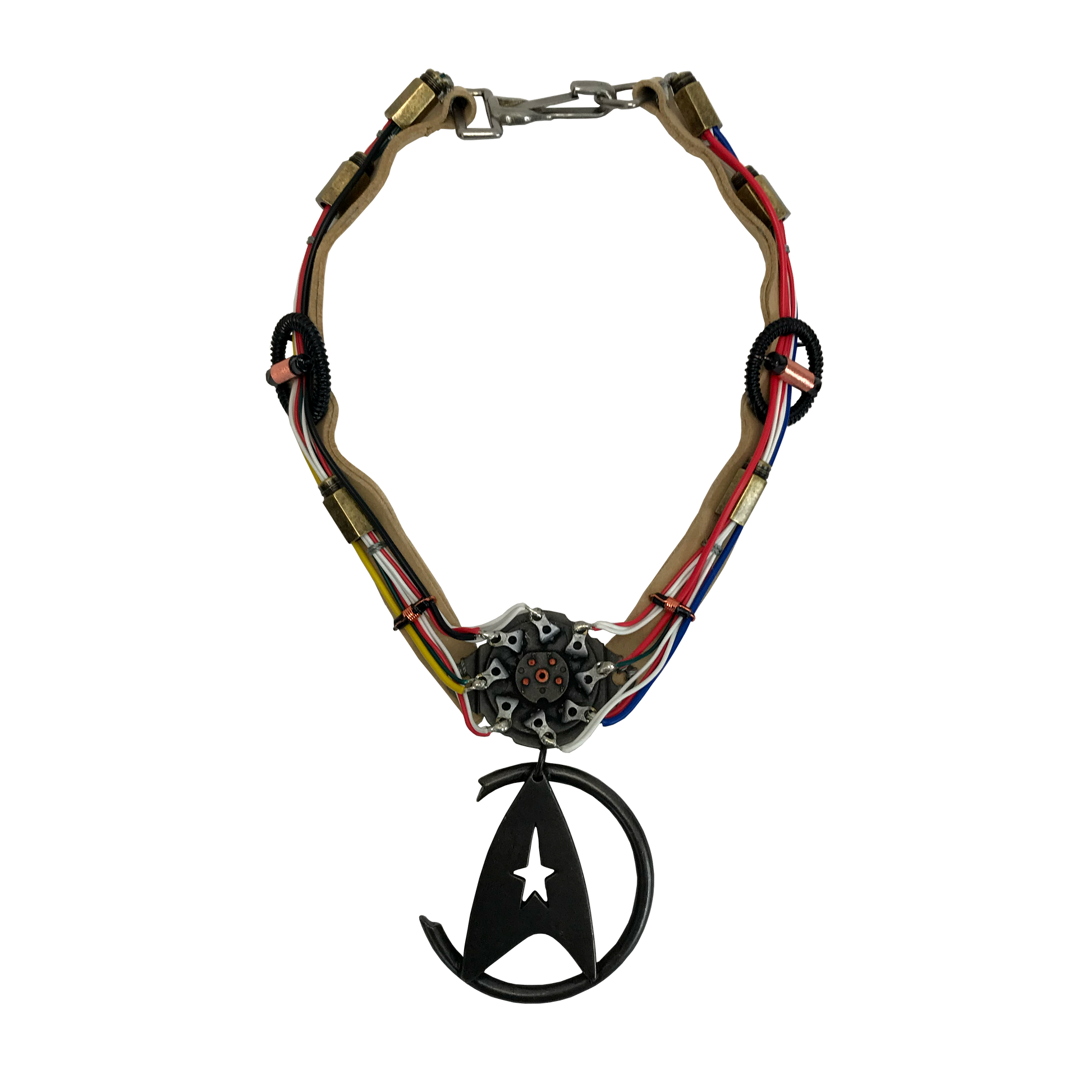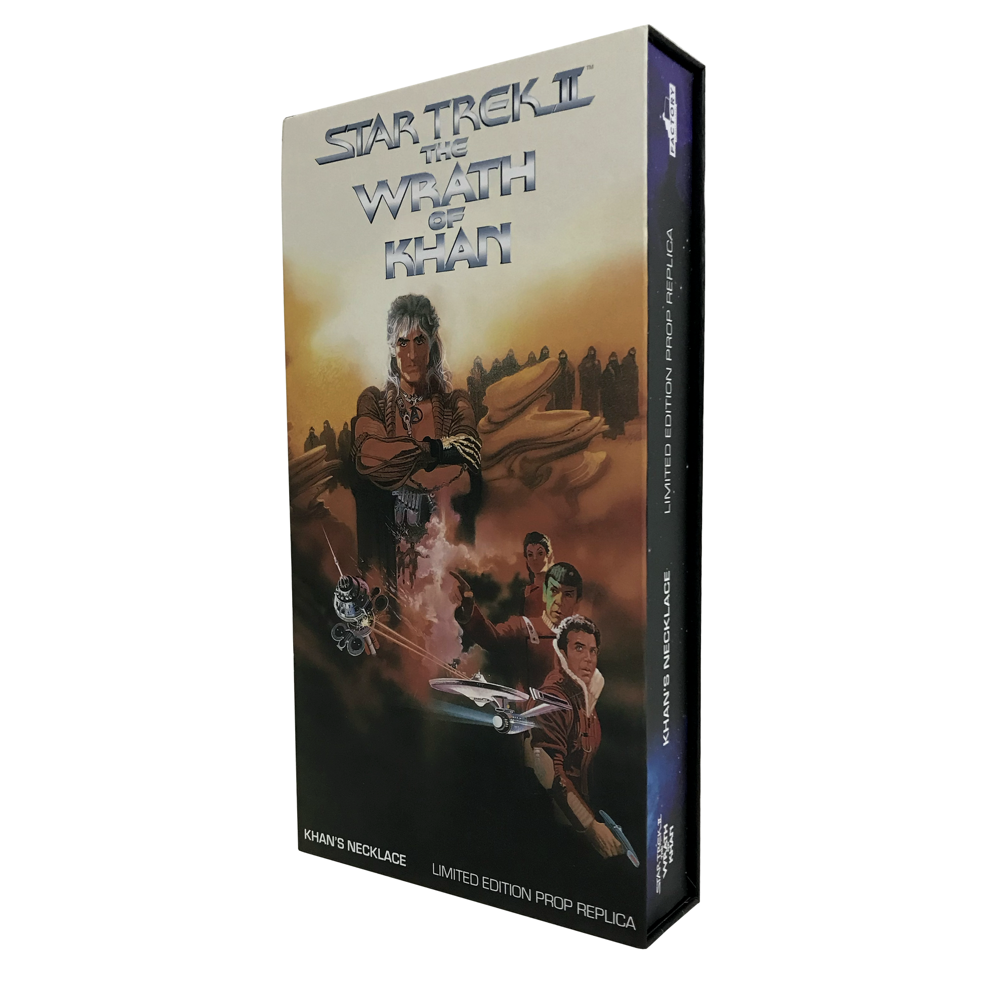 The replica of Khan's notable necklace, featured in Star Trek II: The Wrath Of Khan, is the latest collectible in our line of premium products inspired by Star Trek. During filming, multiple variations of the necklace were used, each featuring unique elements and incorporating real-world components. Our expert team carefully studied the remaining original props and referenced materials from the Paramount Pictures archives to accurately recreate each component. To ensure the highest quality, we meticulously replicated even the most delicate and rare vintage electrical parts in solid metal. From the correct gauged and colored electrical wire to the imitation-suede band that mirrors the original, every detail was thoughtfully hand-crafted. The limited edition replica captures the undamaged necklace as seen throughout the film, before the significant battle damage it sustained in the Mutara Nebula. Packaged in a magnetic flap gift box and accompanied by a COA booklet with a unique number, this replica pays tribute to the iconic U.S.S. Reliant with a limited edition of only
